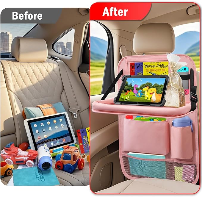 - Multi Storage Pockets : The car seat organizer backseat has 6 different-sized and styled pockets,work great to store various items such as toys, snacks, baby bottles, tablets, phones, sunglasses, books, a great travel essential for kids.