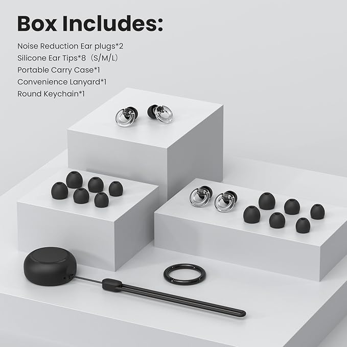 - In the Box: 2 pairs of earplugs; 8 pairs of ear tips (S/M/L);Carry case with silicone rope*1; round carabiner*1; Hope everyone enjoys that piece of serenity in their lives.