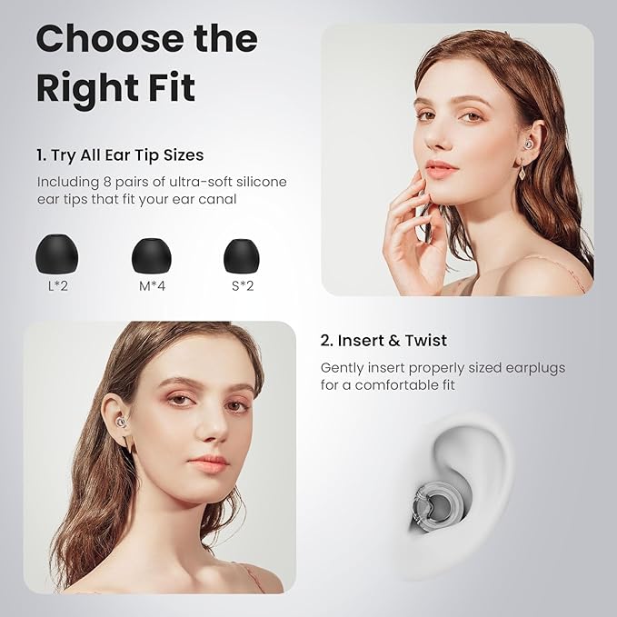 - Easy to Use&Customize Fit: Gently pull your ear, insert the noise-reducing earplugs, and use your fingers to adjust and twist them until they fit comfortably. You can choose different silicon ear tips to apply your ear canal for perfectly fit, making it painless to wear for long periods of time while effectively reducing the impact of sound waves on the eardrum.