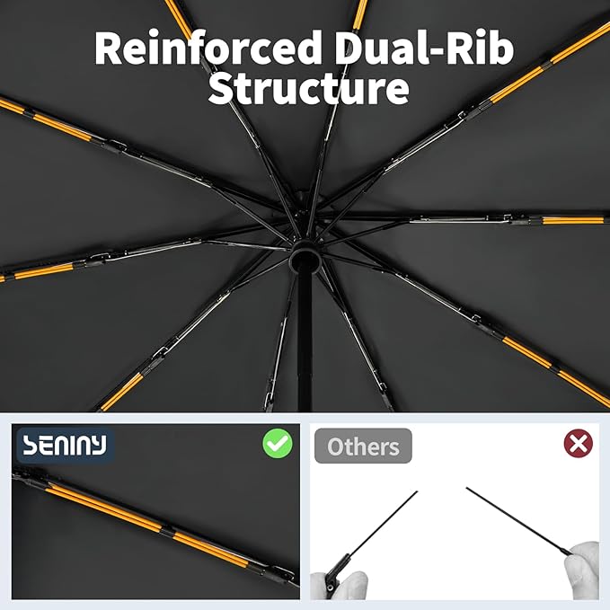 - 【Reinforced 10-Rib Large Umbrella】Wind or rain, this travel umbrella compact won't let you down! Boasting a dual-rib aluminum structure, it stands strong against heavy winds. Say no to a flipped umbrella large on gusty days. Its canopy is high-density and flexible, repelling water with ease and keeping you dry on rainy days.