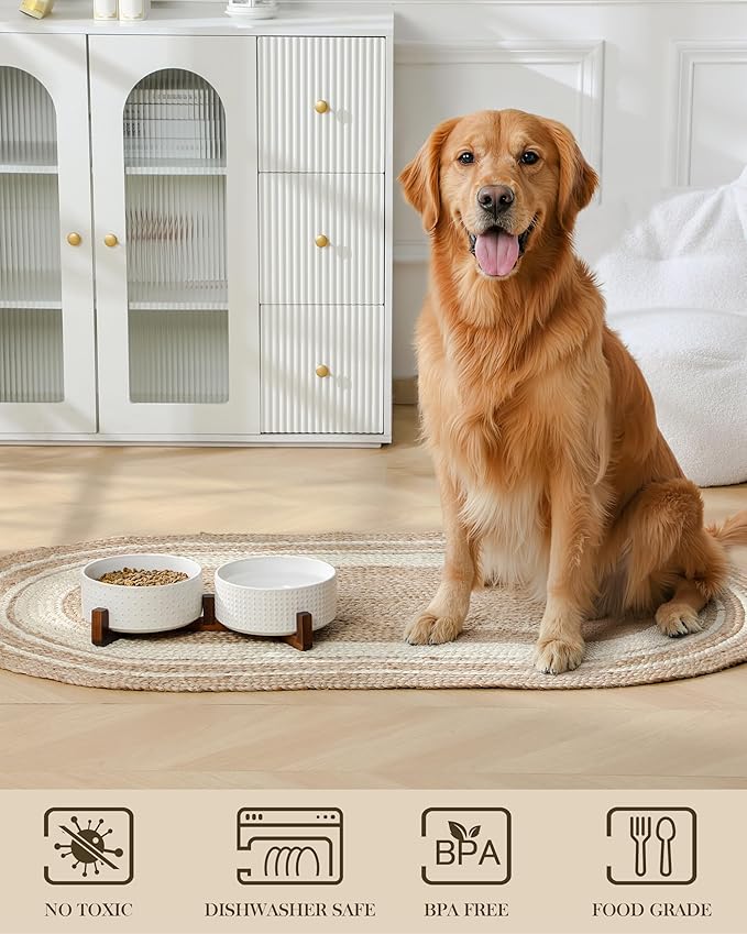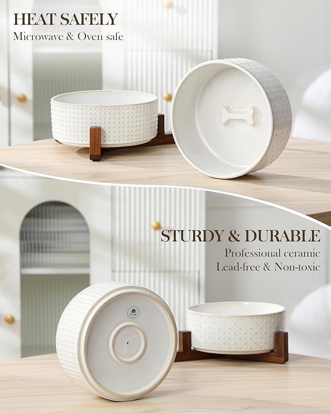 - 🦴【ELEGANT DESIGN】Featuring embossed Rhombic and Polka Dots patterns, paired with a stylish walnut wood stand for elevated dining. These ceramic dog bowls combines classic and modern styles to enhance its visual appeal. The cleverly designed dog bone-shaped decoration at the bottom adds both beauty and fun.