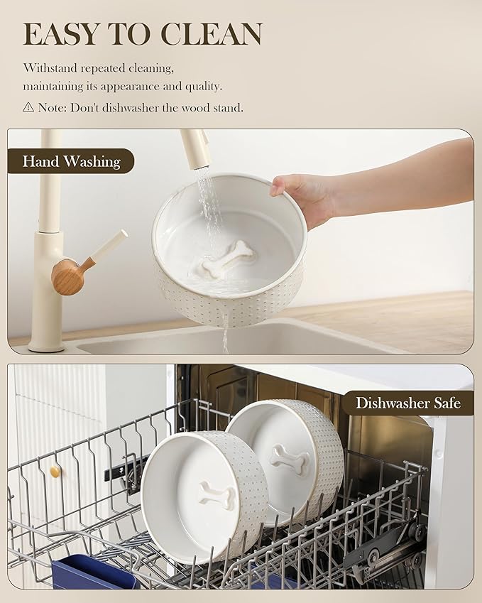 - 🦴【EASY MAINTENANCE】The ceramic bowls can be easily removed from the wooden stand for quick cleaning and convenient refilling. Featuring an active glaze finish, they are dishwasher safe and easy to clean by hand. Microwave safe as well, these bowls allow you to warm up your pet's food whenever needed.