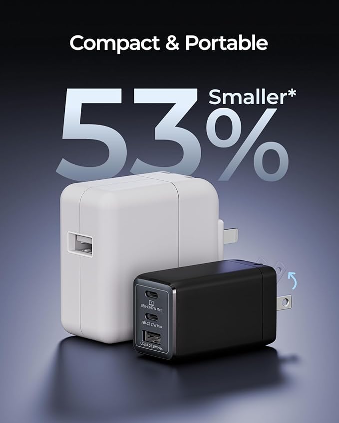 - Compact and Foldable: Powered by advanced GaN chips, the wegear 67W USB-C charger is 53% smaller than standard chargers. Its foldable plug and lightweight design ensure maximum portability, anytime, anywhere.