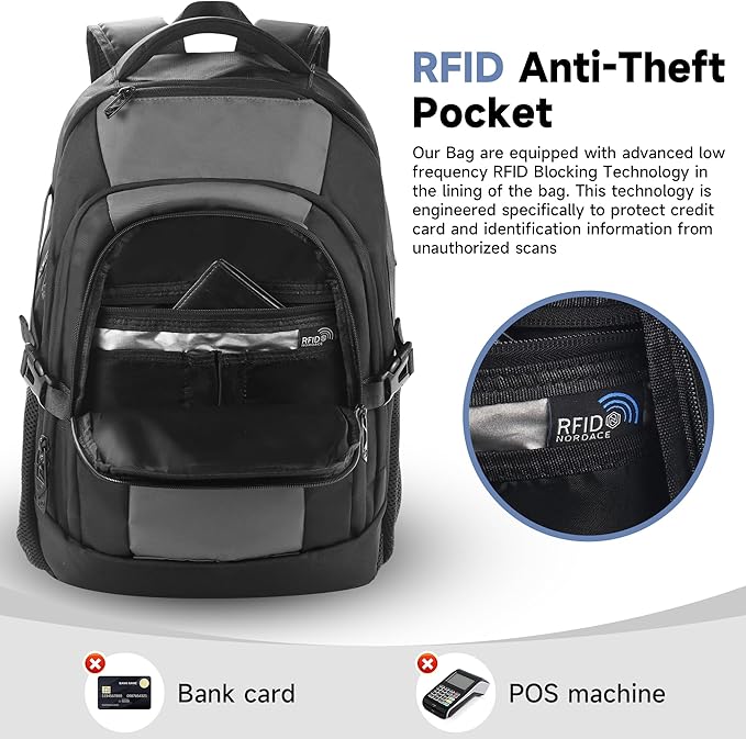 - 【RFID DATA PROTECTION】: Travel with peace of mind. Work backpack for men with an integrated RFID protection compartment, which helps to protect your sensitive personal data (such as credit cards, passports, and driver's licenses) from being accessed by scanners. With a hidden anti-theft pocket on the back, protect your valuable items from thieves. Well-made for international airplane travel and a day trip as a travel present for men