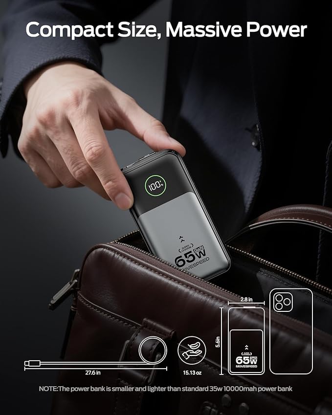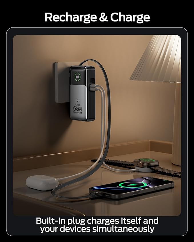 - 3-in-1 Power Bank - Your all-in-one charging solution! This 20,000mAh power bank features 65W fast charging, a built-in 70cm(27.6in) USB-C cable, and foldable plug. Charge phones anywhere - no extra cables needed. Compact and travel-ready for on-the-go power