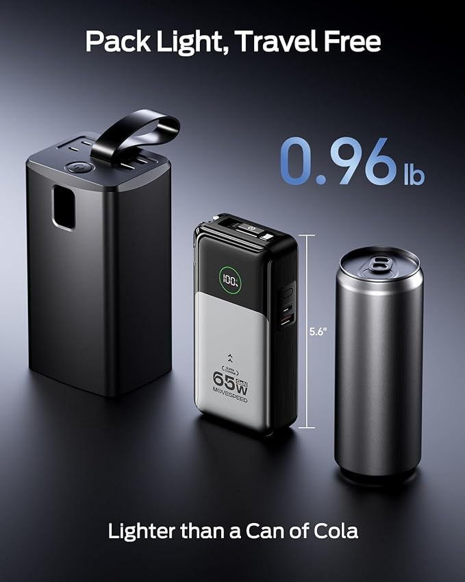 MOVE SPEED Portable Charger Laptop Power Bank 20000mAh 65W, Travel Essentials Battery Pack with Built-in Retractable USB-C Cable & Wall Plug, for MacBook/iPhone 17/16/15/iPad/Galaxy/Dell/HP and More