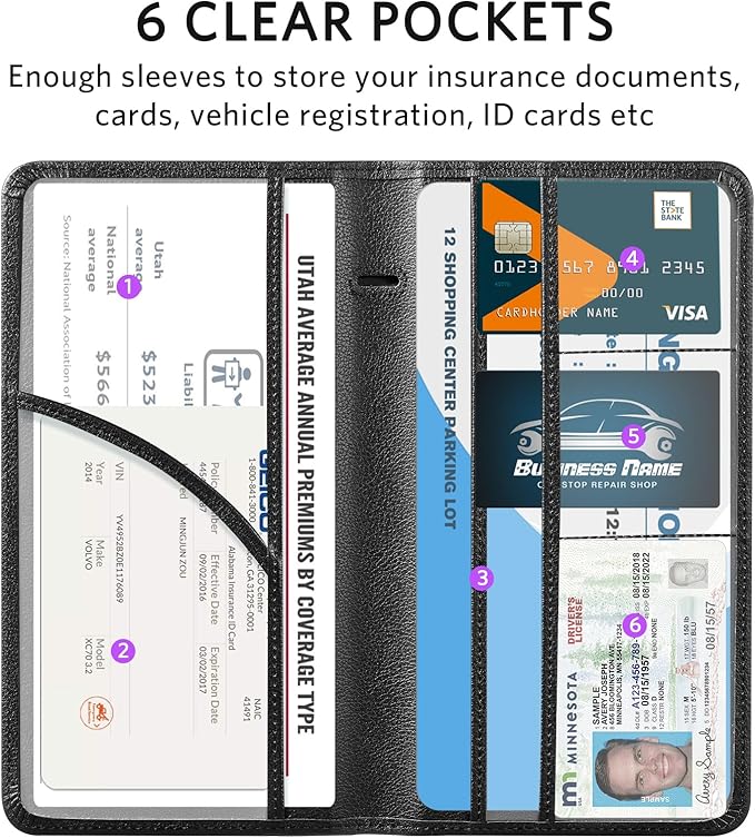 - 6 Comparments: Comes with 3 large pockets for insurance documents, vehicle registrations cards and other valueable information. And 3 small pocket for driver's license, ID cards, business cards, key contact information cards.