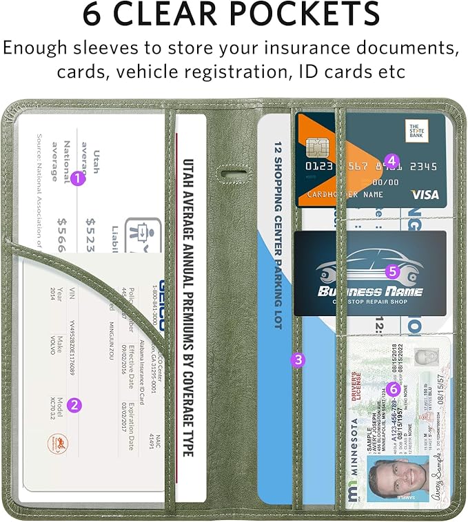 - 6 Comparments: Comes with 3 large pockets for insurance documents, vehicle registrations cards and other valueable information. And 3 small pocket for driver's license, ID cards, business cards, key contact information cards.