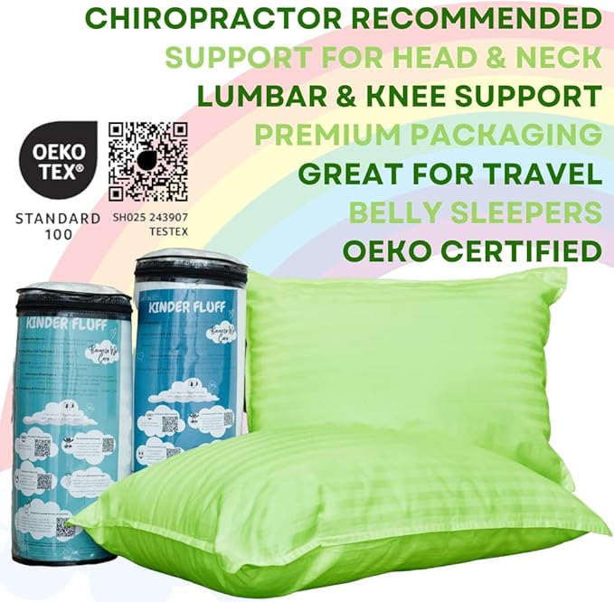 kinder Fluff Children Pillow (2Pack) 10x15in - First Pillow for Kids Age 2+, 100% Cotton Sateen Stripes Shell 300T, Down Alternative Fill, Machine Washable - Children & Travel Cushion - Green - XS