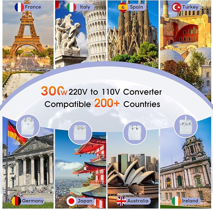 - 【300W Enhanced Power Capacity】 The advanced step down converter supports devices from 0 to 300 watts, suitable for most low to medium-power appliances, such as hair straighteners, curling irons, electric toothbrushes and electric shavers (Note: It is not intended for high-power devices above 300W such as hair dryers or electric iron)