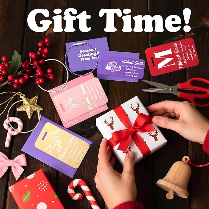 - 8 Vibrant Colors: Choose from 8 eye-catching metallic shades (Black, Blue, Red, Gold, Green, Purple, Pink, Lake Blue), each shifting hues with the light. Available in two sizes (3"×1.2" & 3.5"×1.9"), the tags stand out on crowded baggage carousels. The matte finish adds sophistication while enhancing durability