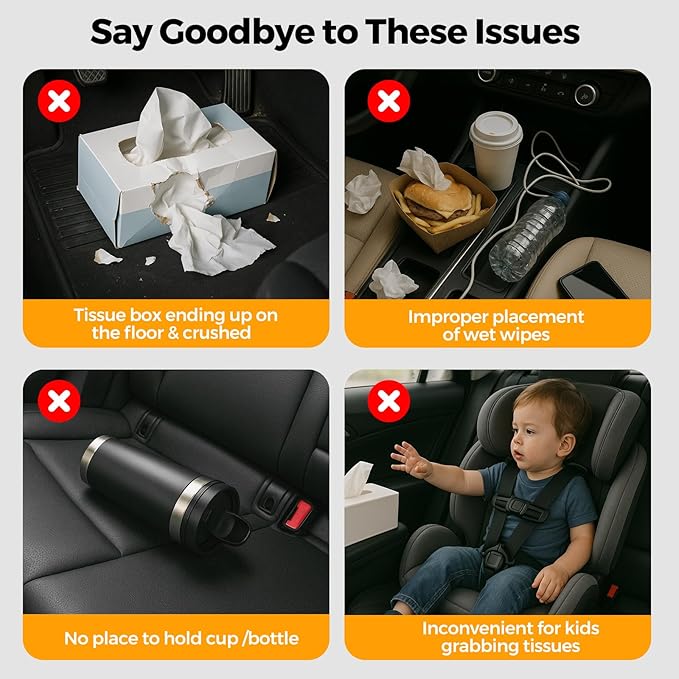 - 【End Messy Car Rides with Practical Organization】The KZBHHP Car Tissue Holder revolutionizes your vehicle’s back seat organizer system. Designed for busy families, this car backseat storage box combines a full size tissue box holder (fits for 100-130 regular size tissues) with extra cup holders for back seat and spacious compartments. No more torn tissues or spilled drinks! The headrest storage for car system secures household-sized tissue boxes, wet wipes, snacks, toys, and essentials via car organizers and storage back seat design. Durable straps attach securely to car seat organizer back seat structures, keeping items within kids’ reach while maintaining cabin cleanliness.