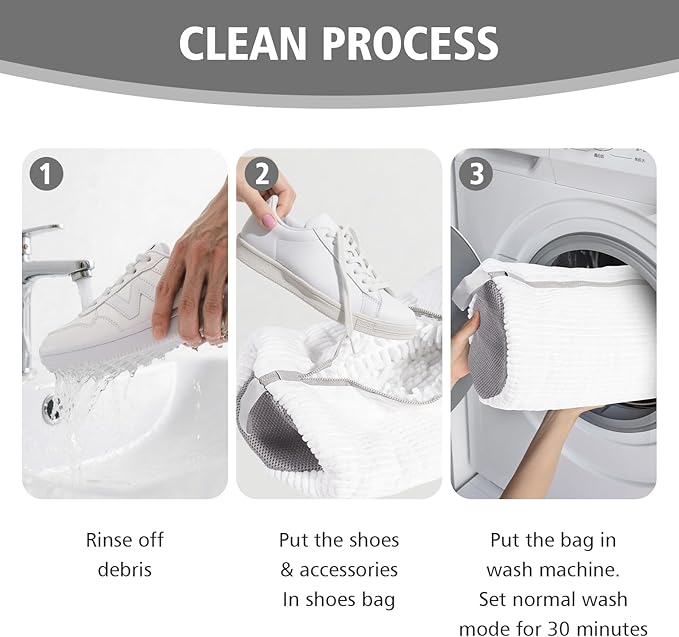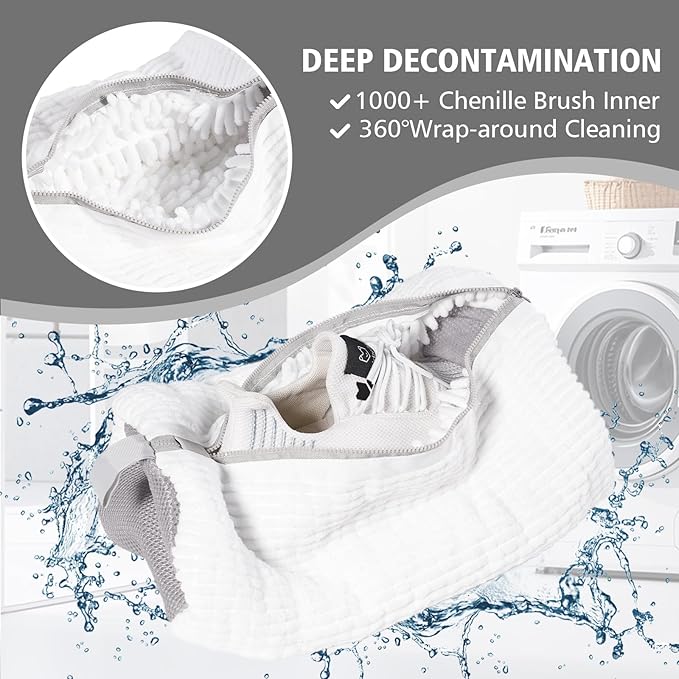 - 360° Deep Clean for Shoes: Shoes bag for washing machine feature a deep cleaning design. Two side of laundry shoe bag is made of mesh hole and render the detergent and water easily flow into the shoes. Inside the shoe laundry bag for washer and dryer is 2000+ 3cm long chenille microfiber for 360° cleaning in all direction to ensure shoes thoroughly and gently cleaned in the washing machine.