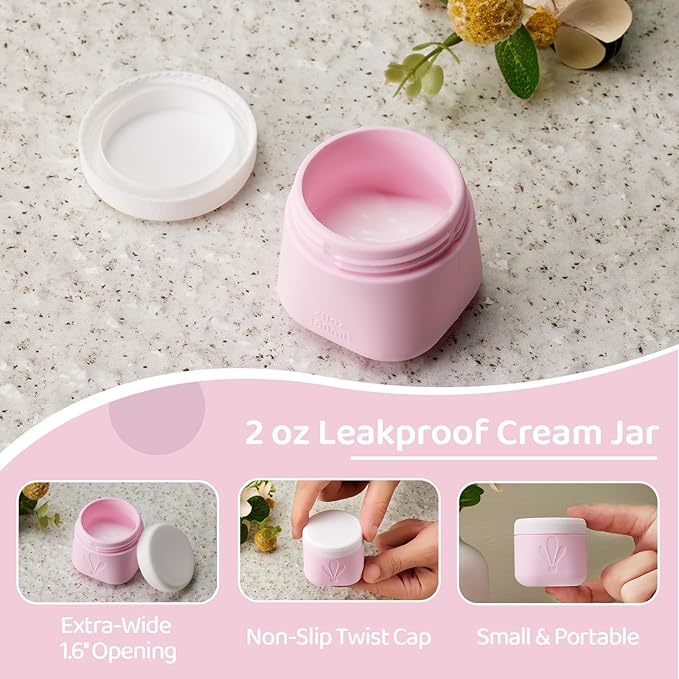 - 2oz Wide-Mouth Silicone Cream Jars: Extra-wide 1.6-inch opening (4cm) allows easy scooping with fingers or spatulas, paired with anti-slip screw lids for leakproof storage of thick creams, balms, or serums. INSFIT small travel containers for creams are your ideal travel accessories.