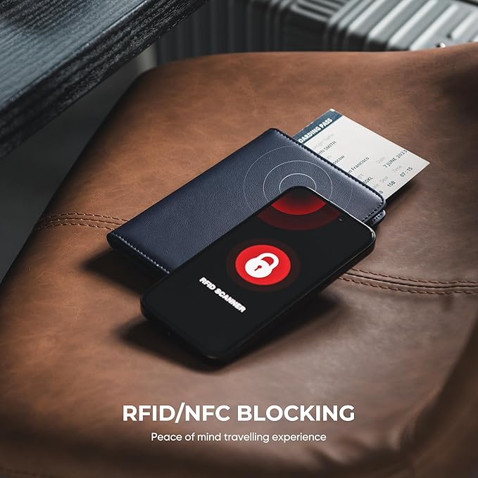 - RFID/NFC Protection: Professional tested RFID/NFC blocking material & technology keep you safe from fraud scanning. Free from data leakage or property loss due to fraudulent swipes in unfamiliar environments. Especially suitable for international travel and business trips.