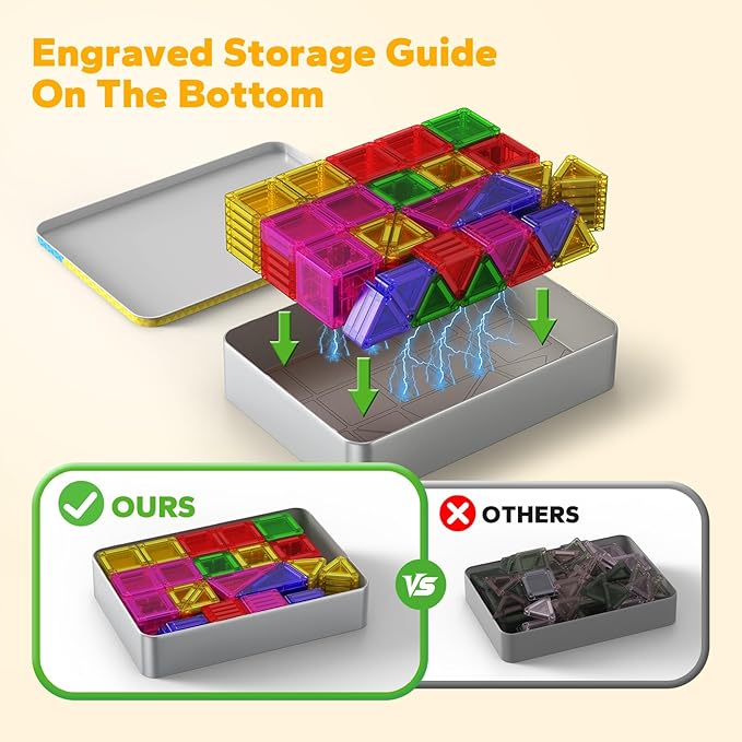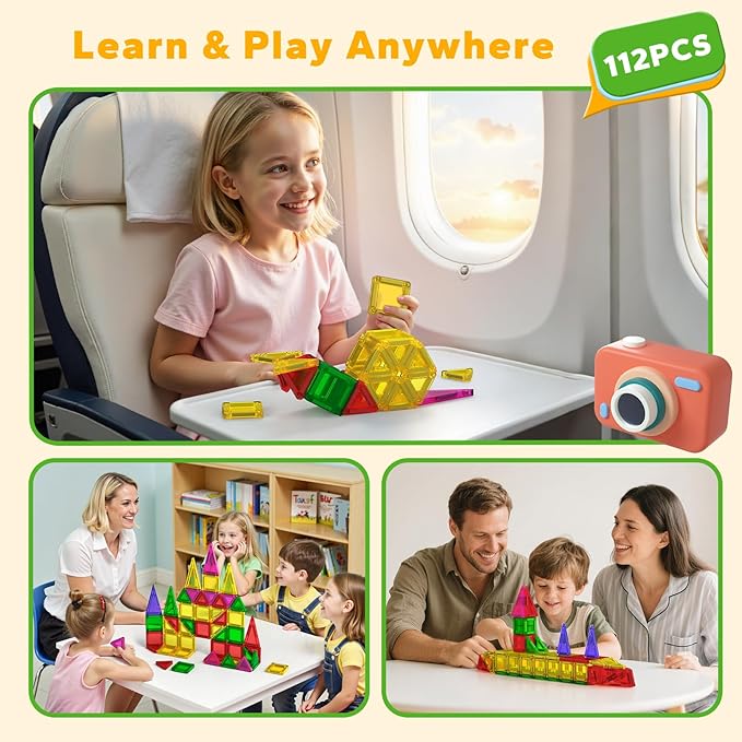 - MAGNETIC TILES WITH TRAVEL CASE: Portable 112-Piece magnetic tiles with iron box. Premium metal case doubles as a building base and crush-resistant storage. Easy to put away for storage no more lost tiles! Compact size slides into backpacks or suitcases, the ultimate travel, camping, and family visit companion!