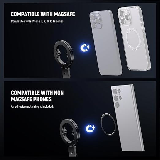 - 【Magnetic Phone Attachment】 The phone tripod mount is fully compatible with MagSafe system, and thus compatible with iPhone 16 15 Pro Max Plus 14 13 12 series, the Mag Safe compatible phone case covers and NEEWER PA006 PA011 PA023 PA024 cages for iPhone 15 14 Pro and Pro Max. For non MagSafe phones, use the included magnetic ring for compatibility with Samsung Galaxy S24 S23 S22 Ultra Google Pixel 7 Pro Huawei, and more as phone camera photography accessories.