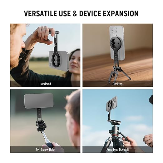 - 【Versatile Use & Device Expansion】 Attach the tripod mount to the back of your phone, functioning as a top handle grip or handheld support for landscape, portrait, and overhead shots, with a cold shoe mount for fill lights or microphones, or expand it to serve as a desktop small phone stand or desktop mini tripod compatible with iPhone for versatility. You can also attach the phone holder to a selfie stick via a 1/4" thread, or mount it on the tripod heads via its Arca type dovetail.