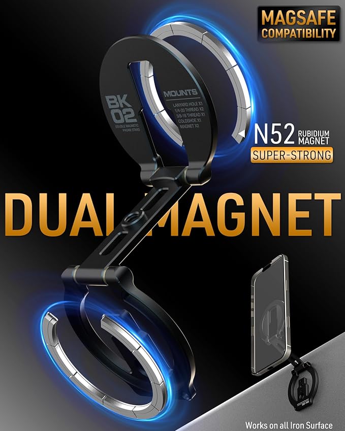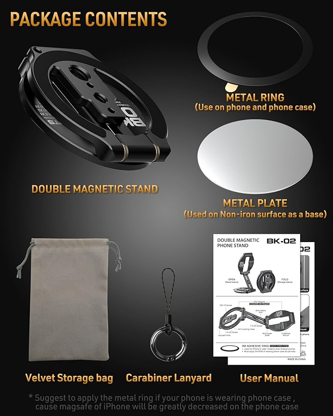 - ๐๐ฎ๐๐ฅ-๐๐ข๐๐๐ ๐๐๐ ๐ง๐๐ญ๐ข๐ ๐๐จ๐ฅ๐๐๐ซ : This magnetic Phone Holder features an innovative dual-sided magnetic system. Each magnetic ring is equipped with powerful N52 magnets, ensuring a secure and stable attachment between your phone and the stand. The double-sided magnetic design allows you to effortlessly attach your phone to any ferrous surface. Or stick the irons sheets (Included) to attach to non-metallic surfaces. ( When you stick the metal ring, please wait for 24 hours before using the ring holder.)