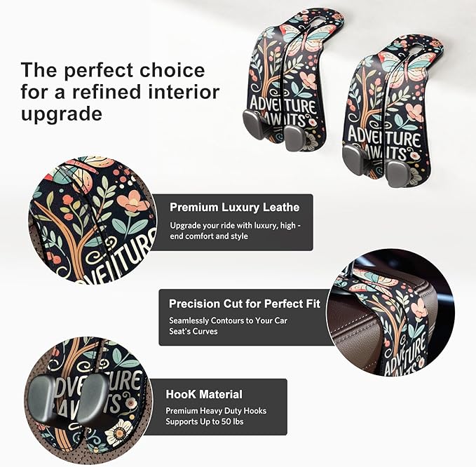 CoBak Purse Hook for Car - Universal Premium Stitched Leather and Aluminum-Magnesium Alloy Double Car Seat Back Storage Hook for Purses, Handbags, Bags (2 Pack),Wander Bloom