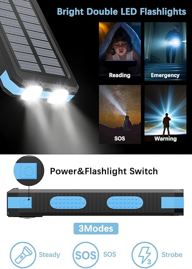 - 【Outdoor Emergency Flashlight】The portable solar charger with LED flashlight has 3 powerful lighting modes (Steady / SOS / Strobe). It is very suitable for emergency situations, power outages, and camping.