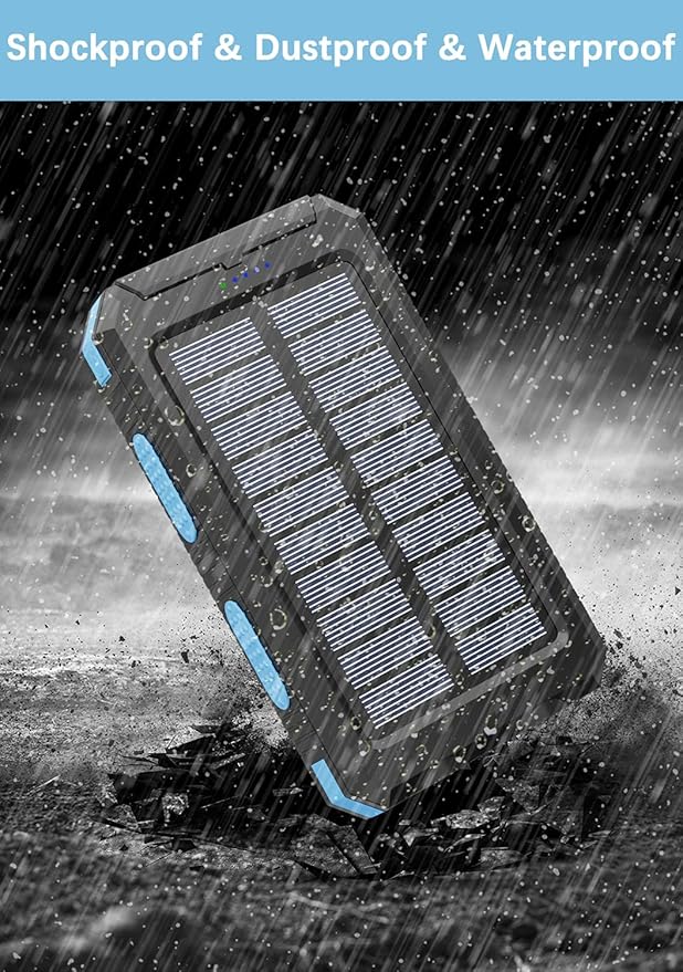 - 【USB & Solar Charging】An outlet or solar panel can charge a solar power bank. The green light is on when charging by a solar, blue light is on when USB charging. Please note that the solar charging speed depends on the intensity of light and its influence on the area.