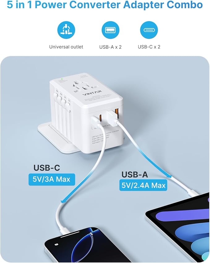 - 5 in 1 Step Down Converter: This power converter for european travel is equipped with universal AC socket and 4 USB charging ports (2 USB C), accept plugs from US, EU, UK, AUS and more countries; The 2 USB A ports can charge up to 2.4A, and 2 USB C ports can charge up to 3A, all the USB ports output 3.4A/17W max. This voltage converter US to europe perfect for charging various USB devices