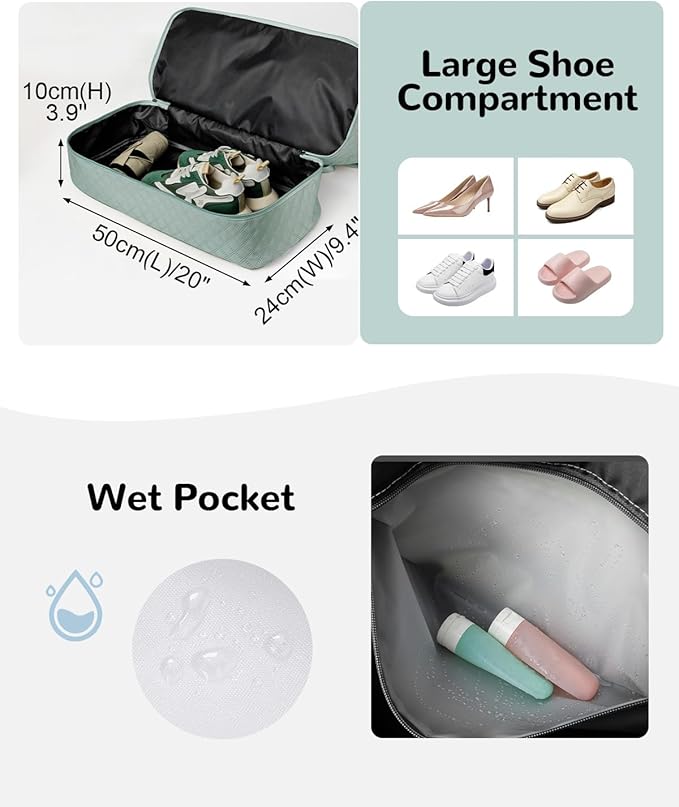 - Large Shoe Compartment: Added a separate compartment at the bottom of travel duffel bag to hold shoes. Measuring 20"(L)*9.4"(W)*3.9"(H) shoe compartment can store more than 1 pair of shoes.