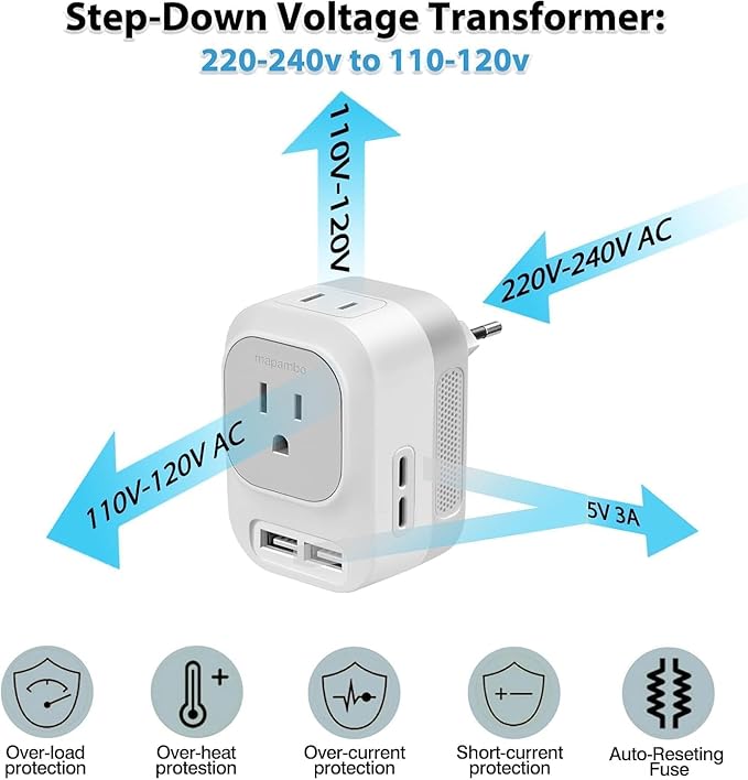- 【NEWLY UPGRADED TRAVEL DESIGN】: Mapambo voltage converter is compact structure (3 * 2.1 * 1.6 inches) and light weight (0.3 pounds), save 70% of the space in the suitcase, making it the first choice for travel across the country, especially Europe.
