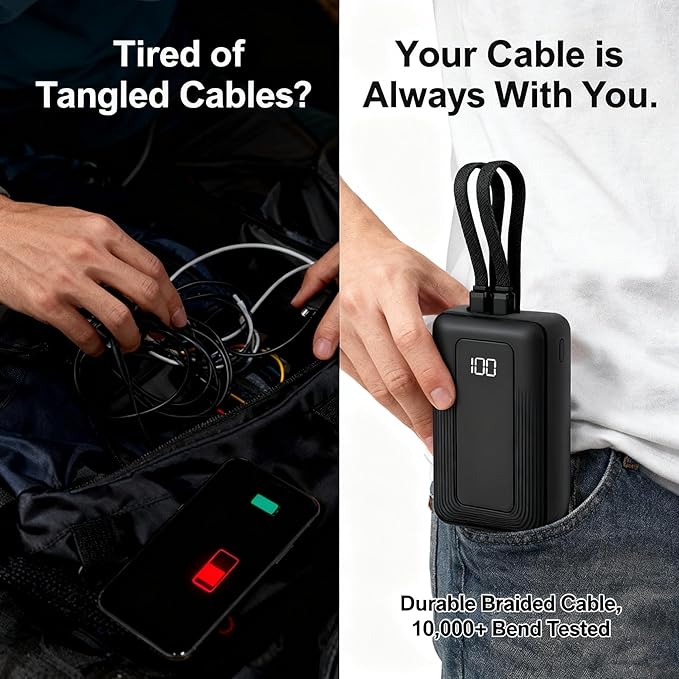 - What's Included: Power Bank (10KmAh, 66W) with built-in Type-C and Lightning cables.