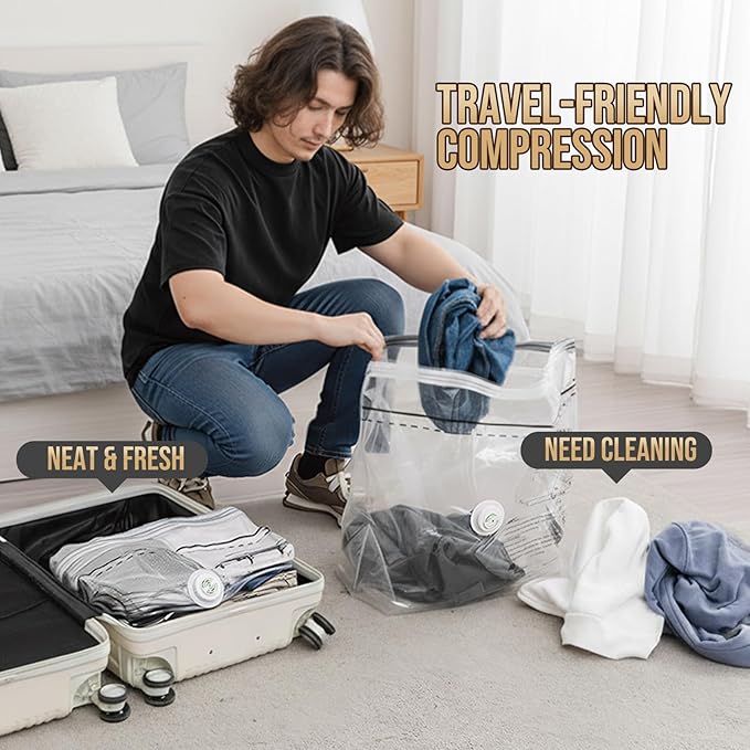 - Stress-Free Traveling: Packing cube vacuum bags help sort, organize, and quickly locate items, reducing the stress of packing. Keep your belongings in order, transparent bags help you identify the contents more quickly without having to open each bag. Enhance your journey with efficient organization, no more clutter in your suitcase or backpack
