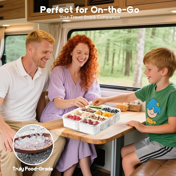 - 【8 Separate Compartments for Organized Snacking】Features multiple divided compartments to neatly separate nuts, fruits, candies, crackers, and charcuterie. The secure lid with silicone seal keeps your snacks fresh, organized, and easy to access anytime.