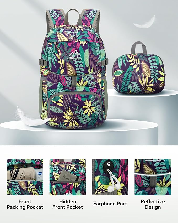 WATERFLY Hiking Packable Daypack Backpack: 25L Ultra Lightweight Day Pack for Woman Man - Small Compact Folding Back Pack for Outdoor Sport Cycling Camping Travel Trip - Print