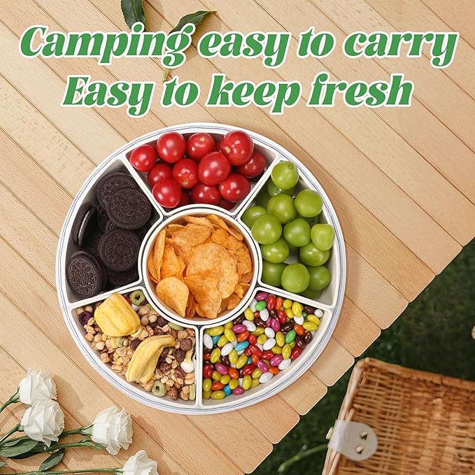 Snackle Box Container Divided Serving Tray with Lid, 6-Compartment Portable Spinning Round Stackable Container, Handle for Organize Veggies, Fruit, Candy, Party Snacks, Nuts, Kitchen Party Essentials
