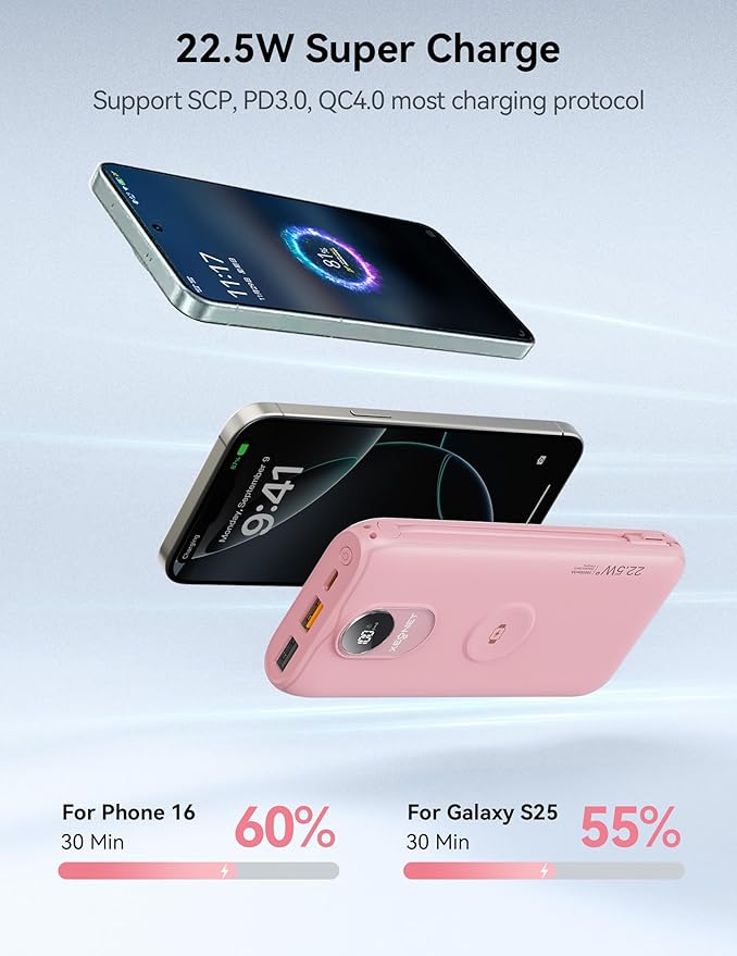 Portable Charger, 10000mAh 22.5W Fast Charging Power Bank with Built in Cable & Wall Plug, Travel Essential Battery Pack with LED Display, External Charger for iPhone, iWatch 11/10/9/8/Ultra/SE Pink