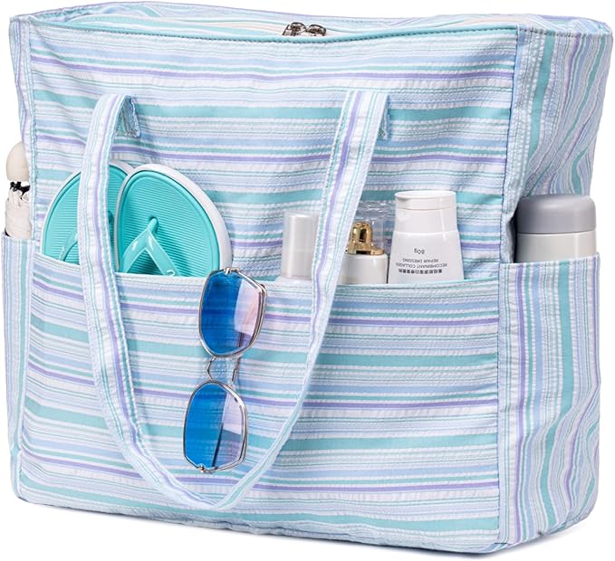 - Waterproof sandproof beach bag has tons of pockets and space for your towels, swim suits, flip flops, water bottles, glasses, sunblock, toys and any other things you'd like to take with you to the beach or pool, and interior pocket to place keys, your wallet or phone and other valuables