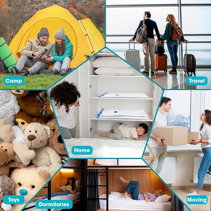 - Easy to Use: Put items inside the travel vacuum bags for luggage with pump, pull up along the toggle 2-3 times to ensure a complete seal, requiring a press of the electric pump's button, remove the air and screw on the sealing cap, saving at most 80% space. Compression bags for pillows can store comforters; blankets; duvets; quilts; seasonal clothes; pillows; plush toys; bedding; wedding dress etc. Vacumaid bags for travel provide airtight; waterproof; dirtproof; moistureproof and dustproof