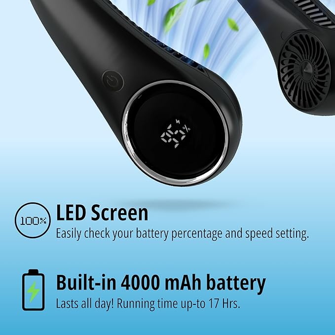 - Engineered for All-Day Performance – With a powerful 4000 mAh battery, our portable neck fan rechargeable offers up to 17 hours of quiet runtime. No bulky cords or frequent charging – just continuous comfort after every charge.