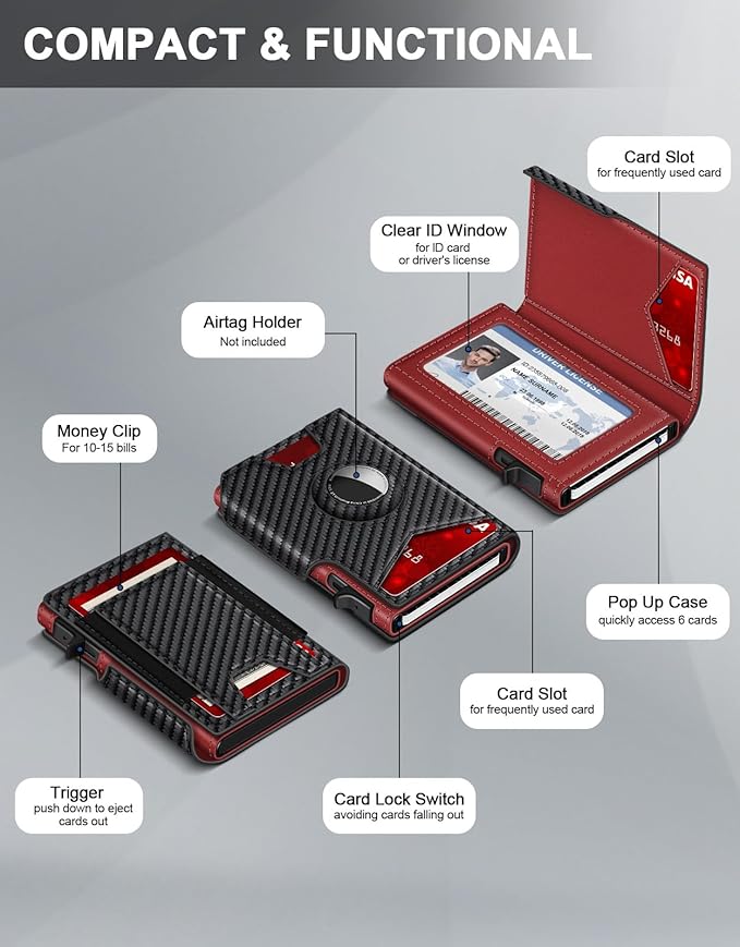- QUICK CARD ACCESS: This leather wallets combines high-quality leather and premium metal, featuring a smooth pop-up mechanism. Simply press the side button on the metal wallet for men, all cards pop up at a step pattern that makes them very easy & convenient to take out.