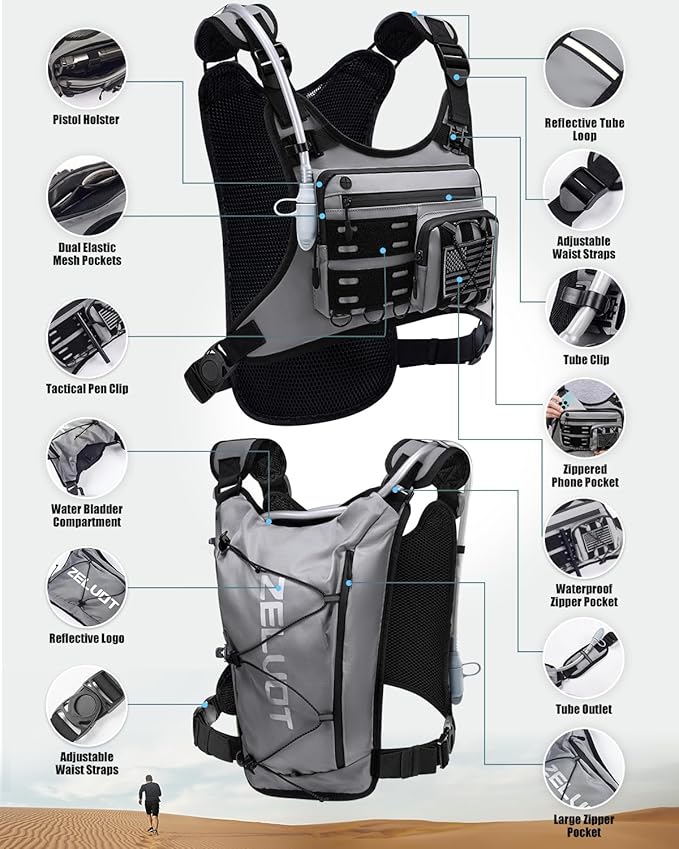 - Plenty of Storage - This chest bag features 3 waterproof zippered front pockets to securely hold essentials like your phone, keys, and energy gels. A detachable, bounce-free pistol holster ensures secure storage for small to mid-sized pistols, while the tactical pen slot keeps emergency gadgets within easy reach. Two large back pockets fit a water bladder, towel, extra clothing.