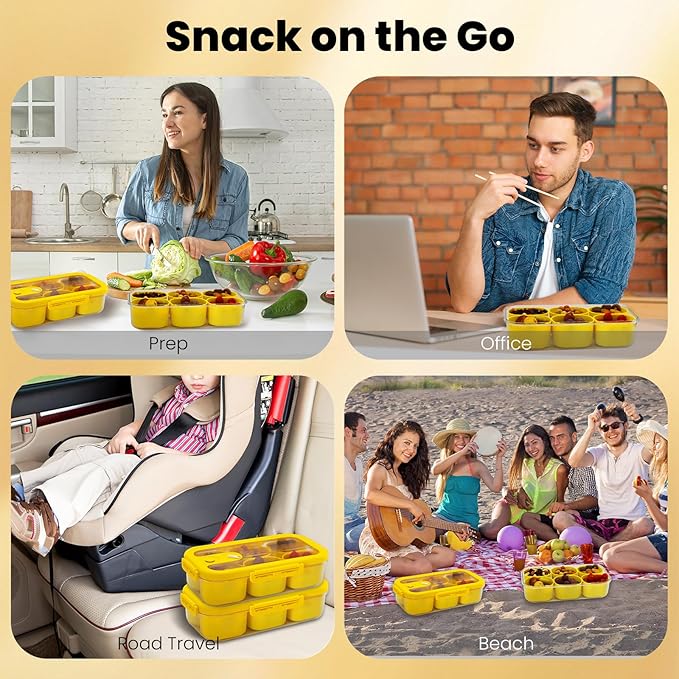 - 【Easy Care and Maintenance】: This reusable snack containers with lids perfect for holding your favorite snacks. To ensure its long service, easy flush wash or hand wash the outer clear shell (NO DISHWASHER SAFE). The inner yellow compartments is dishwasher safe! Keep your snackle container in top shape and ready for use whenever you need it, providing you with a convenient snacking experience every time!