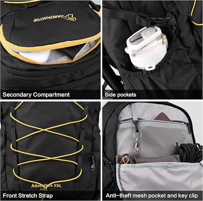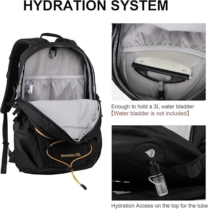 - 【Spacious And Organized Storage Space】: With a 25L capacity for 1-2 day hike or 3 day trip, our travel backpack features a multi-compartment design including one main roomy compartment with a interior sleeve for hydration bladder, one anti-theft classification compartment with multiple layers and key clip, one front pocket and 2 side pockets.