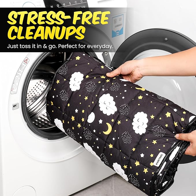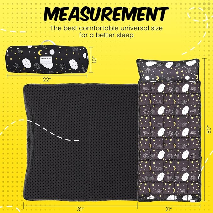 - 【ELEGANT DESIGN】The toddler travel bed features elegant all-in-one design with soft Minky fleece blanket and pillow. The exclusive black night-sky pattern with dreamy star-and-cloud design inspires the children to sleep better and dream bigger. The convenient fastening closure straps and the carrying handle deliver a safe and protected sleeping experience. Easy to roll up for easy traveling.