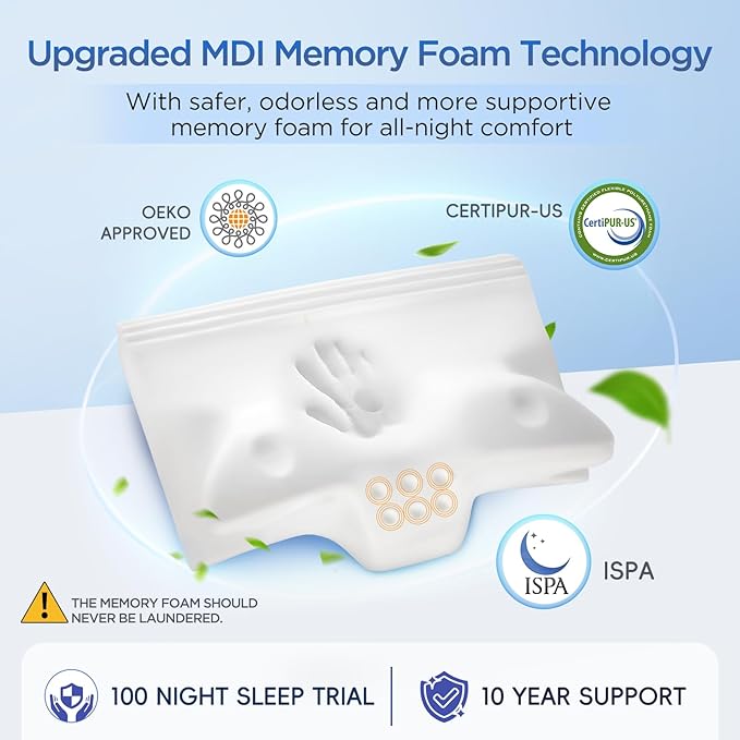 - [ADVANCED MDI & CERTIPUR-US CERTIFIED MEMORY FOAM] Made from high-resilience memory foam using MDI technology, which offers stronger support, better durability, and zero odor. It won't flatten over time, offering consistent comfort and making it an ideal pillow for neck pain relief and long-term use