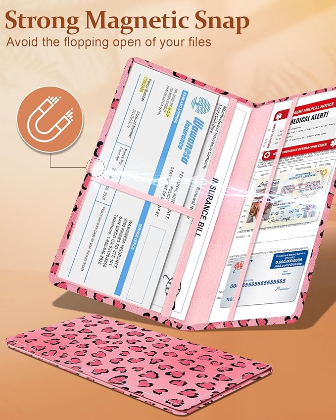 Slohif Car Registration and Insurance Card Holder - Leopard Vehicle Glove Box Organizer Women with Magnetic Shut Leather Automobile License Holders Coasters Auto Accessories Case for Document