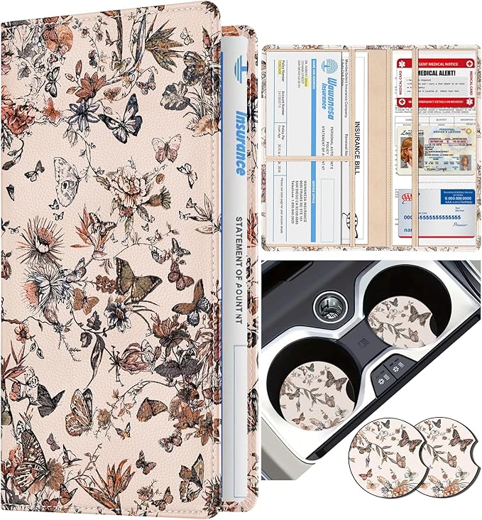 - Combination set: The combination package includes the car registration and insurance holder along with a matching car coaster,making for an eye-catching set. This not only serves a practical purpose but also enhances the aesthetic appeal