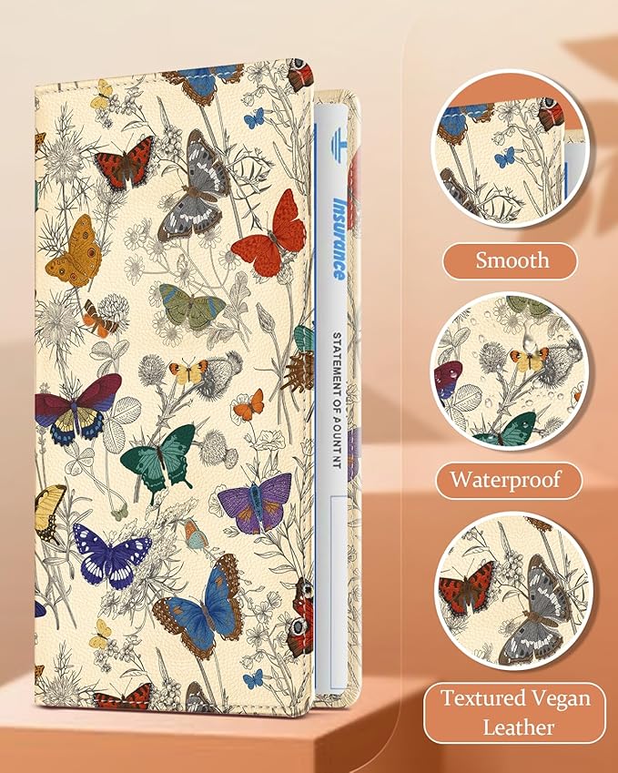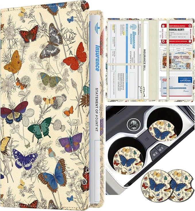 Slohif Car Registration and Insurance Card Holder - Butterflies Vehicle Glove Box Organizer Women with Magnetic Shut Leather Automobile License Holders Coasters Auto Accessories Case for Document