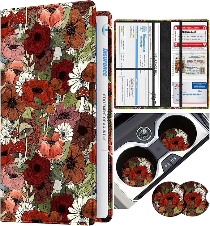 - Combination set: The combination package includes the car registration and insurance holder along with a matching car coaster,making for an eye-catching set. This not only serves a practical purpose but also enhances the aesthetic appeal