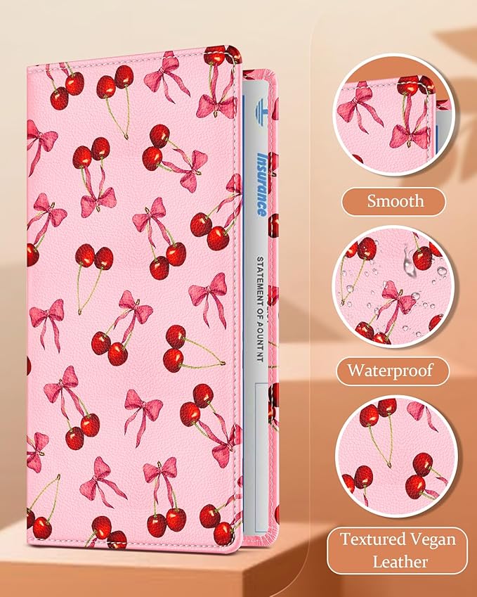 Slohif Car Registration and Insurance Holder - Cherry Vehicle Glove Box Organizer Women with Magnetic Shut Leather Automobile License Holders Coasters Auto Accessories Case for Document
