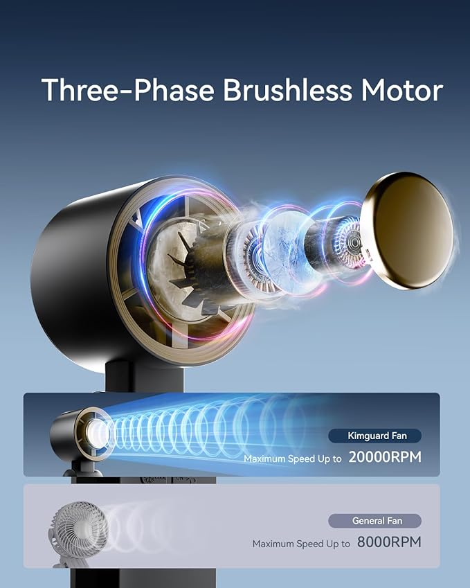 - Ultra-Fast Turbo Cooling: Features an advanced 7-blade design paired with a high-speed three-phase brushless motor, delivering a maximum wind speed of 8.5m/s – 2x faster than traditional hand held fans! With a 20000 rpm maximum speed, it instantly blows away the heat, keeping you cool and comfortable all day long